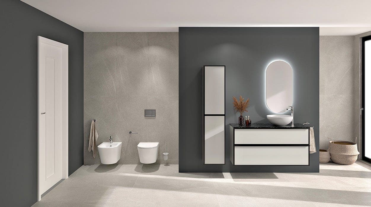 Por último, las cerámicas están perfectamente integradas en este baño completo Onyx con Belvy Grey como la mejor elección posible.