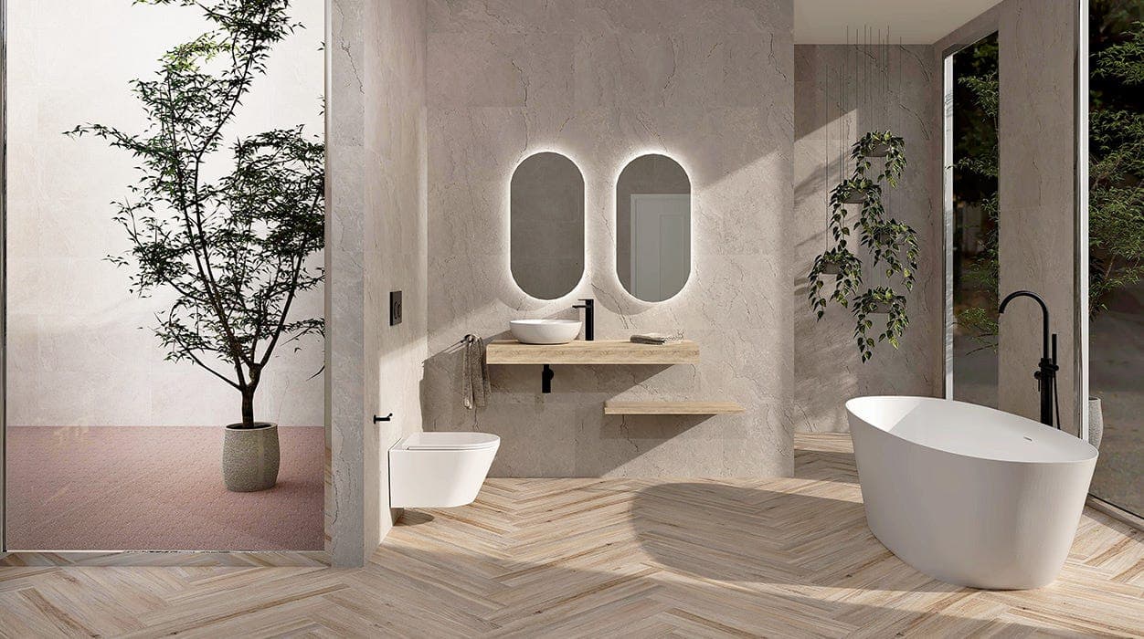Las cerámicas son el primer paso. La primera pieza clave de nuestro refugio es el modelo Riska Pearl en paredes y el porcelánico Artwood Miel en el suelo. Una combinación realmente encantadora.