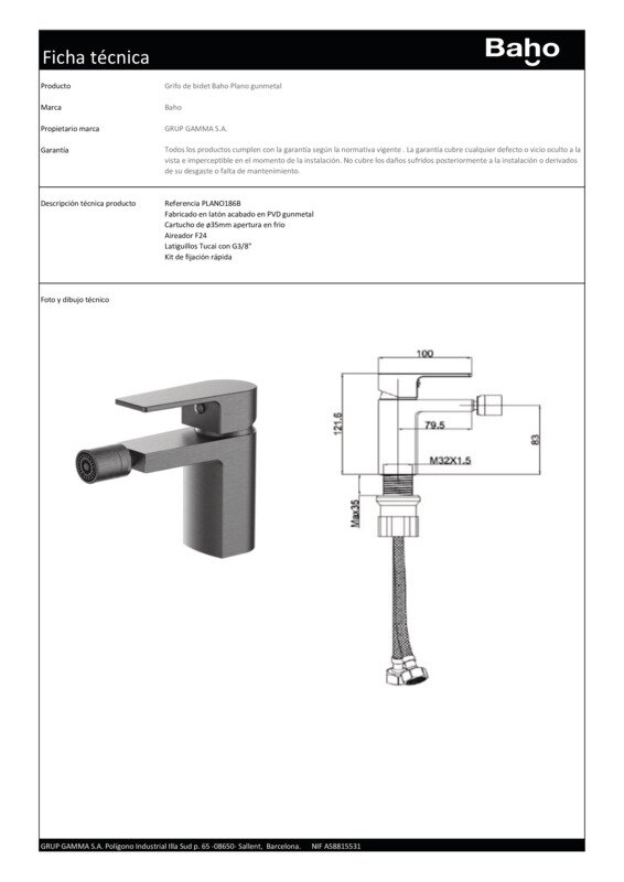 El grifo de bidé gunmetal Baho Plano destaca por su diseño moderno, funcionalidad y resistencia, pensado para baños de estilo contemporáneo. Fabricado en latón de alta calidad con acabado PVD gunmetal, garantiza una durabilidad excepcional, protegiéndolo frente al desgaste, la corrosión y la pérdida de color. Con una altura de 12,1 cm, este grifo es perfecto para un uso cómodo y ergonómico en el bidé. Su aireador oculto asegura un flujo de agua uniforme y eficiente, reduciendo salpicaduras y optimizando el consumo diario. Gracias al sistema de fijación rápida, la instalación resulta sencilla y segura, ofreciendo estabilidad en el uso diario. El mantenimiento es muy fácil: basta con limpiarlo con agua y un paño suave, evitando detergentes abrasivos o con ácidos para preservar su acabado metálico. El acabado gunmetal añade un toque de personalidad y sofisticación al baño, ideal para combinar con otros grifos de la serie Plano o con accesorios en tonos oscuros y metálicos. En definitiva, es un grifo que combina estética elegante, calidad y practicidad, diseñado para quienes buscan un baño armónico y actual.