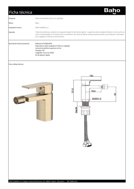 El grifo de bidé oro cepillado Baho Plano es una pieza diseñada para aportar elegancia, practicidad y resistencia al baño. Fabricado en latón de alta calidad con acabado PVD oro cepillado, ofrece una protección sobresaliente frente al desgaste, la corrosión y la decoloración, asegurando que su aspecto cálido y sofisticado se mantenga impecable con el paso del tiempo. Con una altura de 12,1 cm, se adapta perfectamente al uso diario del bidé, proporcionando un manejo cómodo y ergonómico. El aireador oculto garantiza un flujo de agua uniforme y eficiente, evitando salpicaduras y reduciendo el consumo. La instalación es sencilla gracias al sistema de fijación rápida, que asegura una colocación estable y duradera. Para su cuidado, basta con limpiar con agua y un paño suave, evitando el uso de detergentes abrasivos o ácidos, de modo que el acabado se mantenga intacto. El acabado oro cepillado convierte a este grifo en un auténtico elemento decorativo, ideal para crear un baño sofisticado y contemporáneo, combinando perfectamente con encimeras en mármol, muebles oscuros o lavabos blancos mate. Además, al pertenecer a la colección Plano, se puede combinar con otras piezas de la serie en el mismo acabado para lograr un estilo uniforme y exclusivo. En resumen, es un grifo que une estética, resistencia y funcionalidad, pensado para baños que buscan transmitir personalidad y lujo.